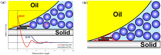 Typically, spherical nanoparticles require a minimum concentration of 0.8 to 1.0 wt% to form wedge films, though some studies suggest that they can do so at even lower concentrations [28,29]. While most SDP research has focused on spherical nanoparticles, our group’s studies and field applications of SLNs over recent years reveal that, in comparison to spherical particles, SLNs can form wedge films at lower concentrations, penetrate further within the wedge region, and deliver superior EOR effects [17,18]. Consequently, both the morphology of the wedge region and the contact angle at the inner contact line are influenced by nanoparticle shape. Figure 4 illustrates the dispersion states of two types of nanomaterials in a wedge film. Due to the ‘sheet-like’ structure and flexibility of SLNs, they can bend during flow, reducing their effective radius, which allows them to assemble closer to the vertex in the three-phase contact region than spherical nanoparticles. Using Equations (1) and (3), the SDP distribution for SLN fluids with an effective diameter of 1.3 to 1.5 nm was calculated and compared to that of 18.5 nm spherical nanoparticles [24]. SLNs with thinner layers exhibit an SDP at the vertex that is 16.5 times greater than that of spherical nanoparticles (Figure 5).