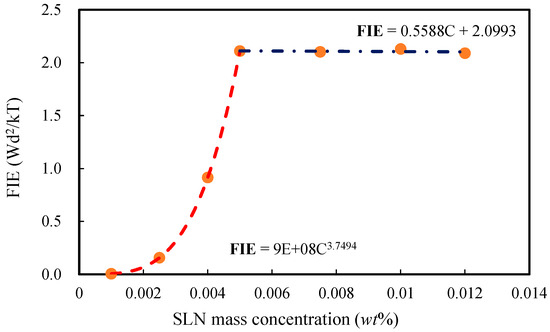 SDP is the key mechanism in SLNs’ oil displacement. Using Equations (2) and (4), the FIE at was calculated for various SLNs mass concentrations (see Figure 6). As the SLNs mass concentration increases, FIE initially rises and then plateaus. When the SLNs mass concentration exceeds 0.005 wt%, further increases in FIE within the wedge film become negligible. Note that FIE units can be converted to N/m.