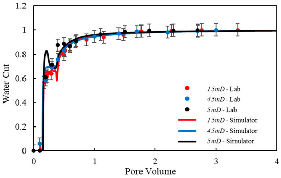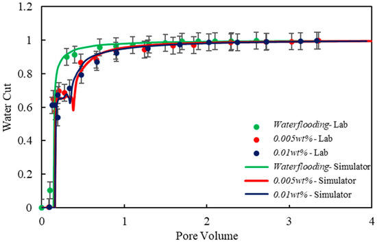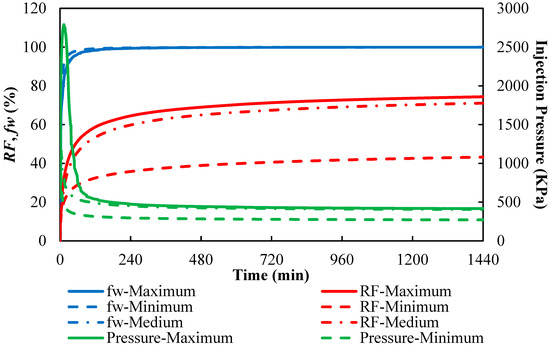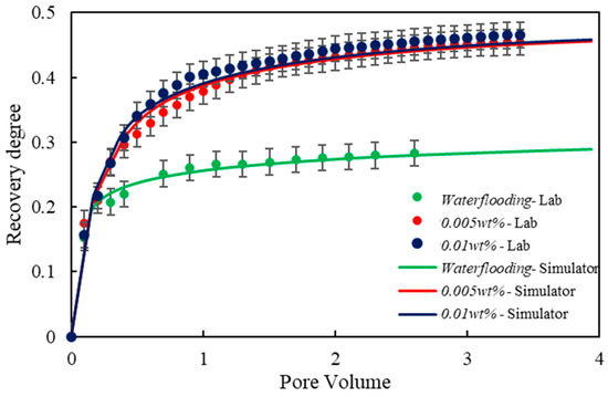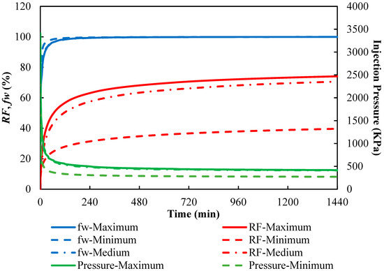Based on the simulation results shown in Figure 6 and Figure 7, where the minimum, medium, and maximum correspond to system concentrations of 0 wt%, 0.005 wt%, and 0.01 wt%, respectively, it can be observed that Tests 1, 5, and 6, as well as Tests 2, 3, 4, and 7, exhibit identical historical trends in core flooding simulations, regardless of whether the oil–water IFT values corresponding to the system concentrations are the same or whether the settings adhere to theoretical expectations.