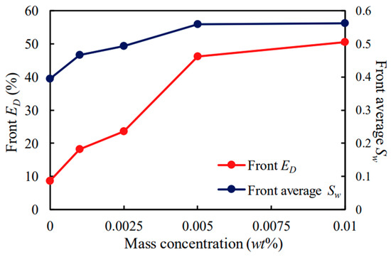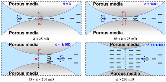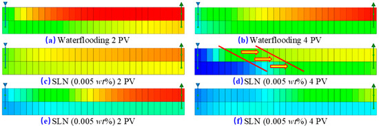 In contrast, the self-profile control and flooding capability in heterogeneous reservoirs with higher average permeability is generally lower. This is because high-average-permeability reservoirs often have larger pore sizes, making SLNs less likely to be trapped. The combined effects of pore size and the boundary layer in smaller pores contribute to the more frequent occurrence of displacement phenomena in medium to low permeability reservoirs, as depicted in Figure 9.