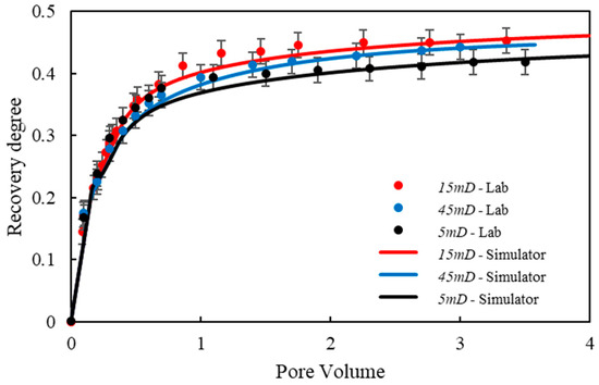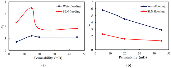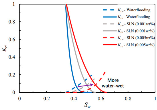 The crude oil used in the experiments is from the Daqing Oilfield in China, with a viscosity of 20 mPa·s at 75 °C and a flow rate of 0.3 mL/min. The viscosity of the SLN fluid is 0.874 mPa·s. The relative permeability curves from Yan’s experiments were digitized, with the relative permeability curve under waterflooding conditions selected as the first set for numerical simulation. In contrast, the relative permeability curve under SLN fluid flooding conditions was used as the second set. To ensure convergence and stability in the CMG-STARS simulator, the relative permeability curves were optimized using the Brooks–Corey method.