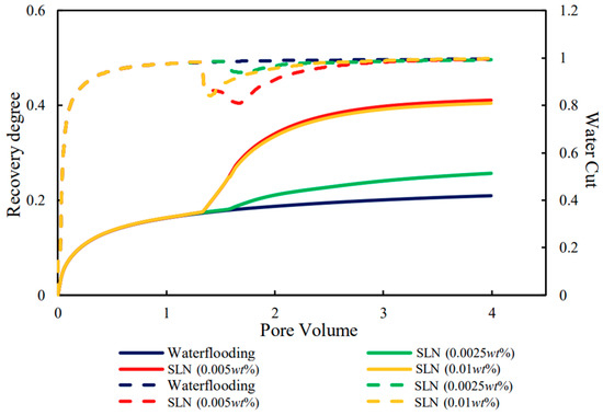 In our prior research, we conducted experimental and field studies to evaluate SLNs’ performance in EOR. These studies demonstrated that SLNs could significantly reduce residual oil saturation without relying on high capillary numbers. For instance, field-scale experiments showed that nanofluids efficiently enhanced recovery without requiring ultra-low IFT, a finding supported by Qu’s laboratory experiments on MoS2 nanofluids [7]. Zhang reached a similar conclusion in their study, where they found that, when using SiO2 nanofluid for oil displacement, a higher displacement rate and capillary number led to a reduction in the effectiveness of nanoparticle-based oil displacement [20]. However, while these studies highlighted the potential of SLNs in oil displacement, they did not incorporate numerical simulations, leaving a significant gap in understanding their interactions with reservoir fluids.