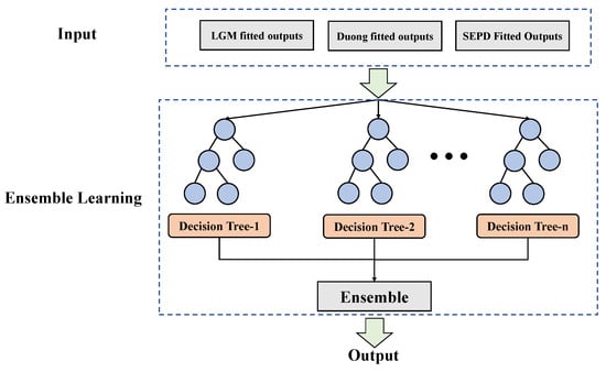 After fitting the LGM, Duong, and SEPD models to historical production data from shale gas wells, we use the fitted results from these models at each time t as input features for the Random Forest model. The Random Forest model, consisting of multiple decision trees, constructs n decision trees based on the fitted outputs of the LGM, Duong, and SEPD models at each time t. It then aggregates the predictions from these n decision trees to produce the final output. Additionally, we provide the detailed steps for model fitting and experiments based on simulated data, as detailed in Appendix A.