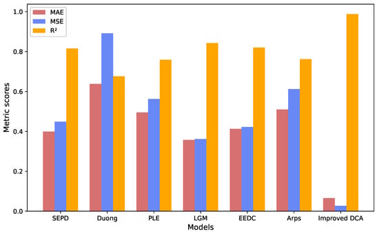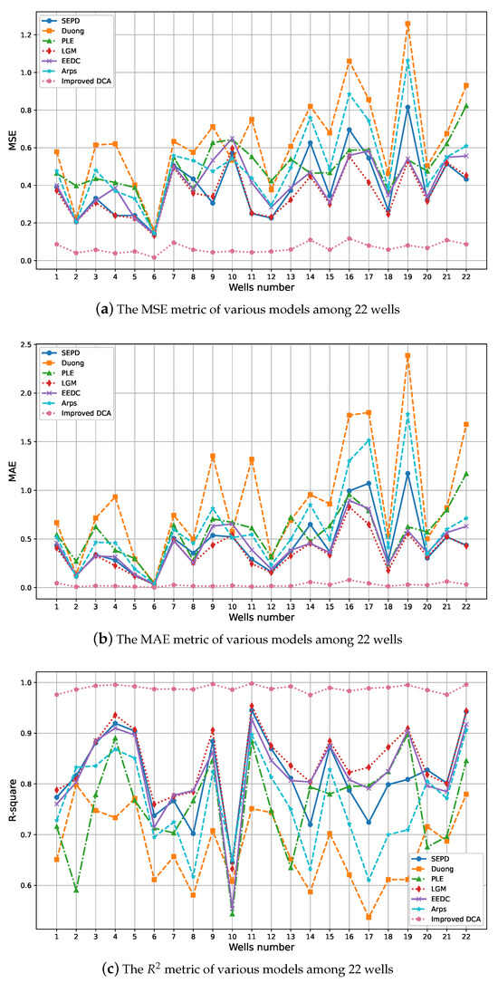 As depicted in Table 4 and Figure 3, the Improved DCA model demonstrates optimal average metric scores in terms of MAE, MSE, and , outperforming the other six traditional DCA models. Specifically, the improved model significantly reduces both the MAE and MSE metric scores, achieving an MAE of 0.0660, an MSE of 0.0272, and an value of 0.9882, indicating higher accuracy in predicting production rates. The high value further confirms that the model explains a substantial portion of the variance in the observed data.