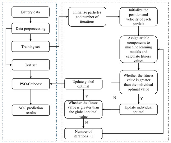 The accurate prediction of battery state of charge (SOC) is one of the critical technologies for the safe operation of a power battery. Aiming at the problem of mine power battery SOC prediction, based on the comparative experiments and analysis of particle swarm optimization (PSO) and Categorical Boosting (Catboost) characteristics, the PSO-Catboost model is proposed to predict the SOC of a power lithium iron phosphate battery. Firstly, the classification model based on Catboost is constructed, and then the particle swarm algorithm is used to optimize the Catboost hyperparameters to build the optimal model. The experiment and comparison show that the optimized model’s prediction accuracy and average precision are superior to other comparative models. Compared with the Catboost model, the Mean Absolute Error (MAE) and Root Mean Square Error (RMSE) values of the PSO-Catboost model decreased by 12.4% and 25.4% during charging and decreased by 5.5% and 12.2% during discharging. Finally, the Random Forest (RF) and Extreme Gradient Boosting (XGBoost) models, both ensemble learning models, are selected and compared with PSO-Catboost after being optimized via PSO. The experimental results show that the proposed model has a better performance. In this paper, experiments show that the optimization model can select parameters more intelligently, reduce the error caused by artificial experience to adjust parameters, and have a better theoretical value and practical significance.