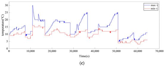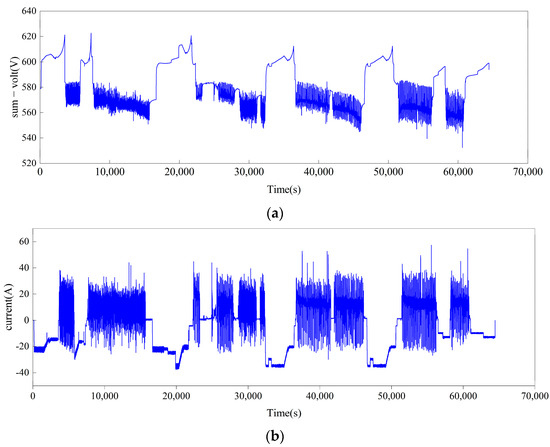 The test data are stored in an Excel format, and the battery voltage (Figure 3a), current (Figure 3b), and temperature (Figure 3c) during charging and discharging are extracted as characteristic data to predict the battery pack’s SOC. The reference SOC value is calculated using the ampere-hour integration method, and the calculation formula is as follows:
