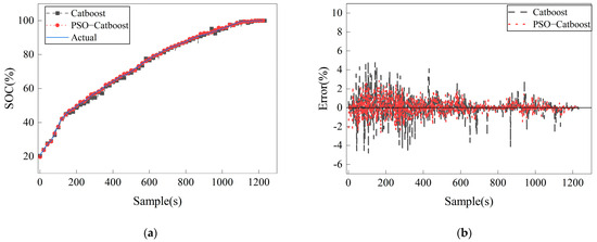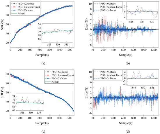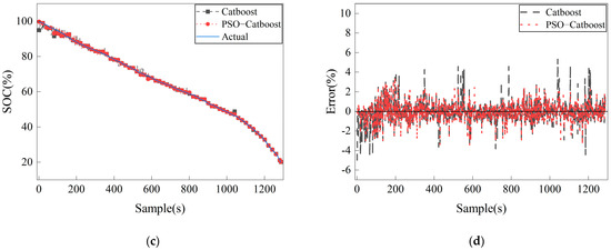 Figure 5 compares the three optimized models’ SOC prediction results and errors. It can be seen from Figure 5a,c that the prediction sequence of all models is above the test sample sequence, indicating that the three optimization models have a good fit with the observed values. In Figure 5b,d, the prediction errors of the three optimization models all fluctuate around the 0 value, and the fluctuation range is between (−5% and 5%). Compared with other methods, the PSO-Catboost model proposed in this paper is closer to the actual value, and the error fluctuation is more minor.
