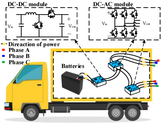 To fully utilize existing equipment configurations and minimize retrofit costs, the EV-SOP retains the original energy storage batteries of the energy storage emergency vehicle. These batteries serve as the DC side for the newly integrated soft open point (SOP), endowing the system with the characteristics of flexibility, dispatchable power, and load support. The architecture of the EV-SOP is shown in Figure 1.
