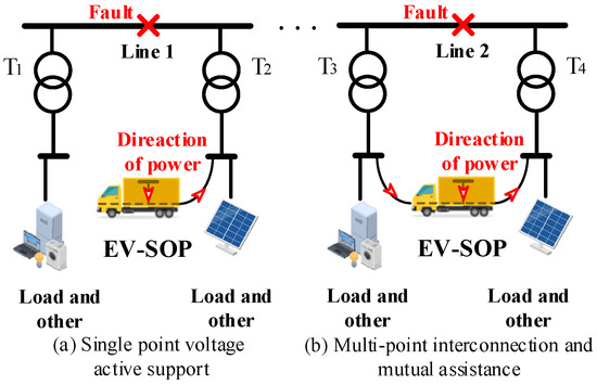 However, due to limitations in vehicle volume, existing EVs have limited capacity for batteries, are insufficient for sustained power supply, and are functionally limited, i.e., unable to perform energy transfer and load flow control on faulty distribution networks. Intelligent soft open points (SOPs), as a new type of power electronic devices, possess the capabilities of multi-feeder interconnection and flexible control and can actively support faulty feeders over extended periods [17,18,19,20]. Consequently, integrating energy storage emergency vehicles with SOPs, thus leveraging the agility of emergency vehicles and the interconnection capabilities of SOPs, not only meets the power control needs under normal operating conditions of the distribution network but also effectively addresses the issue of insufficient sustained power supply capacity of EVs under fault conditions, thus enhancing the reliability of the power supply system.