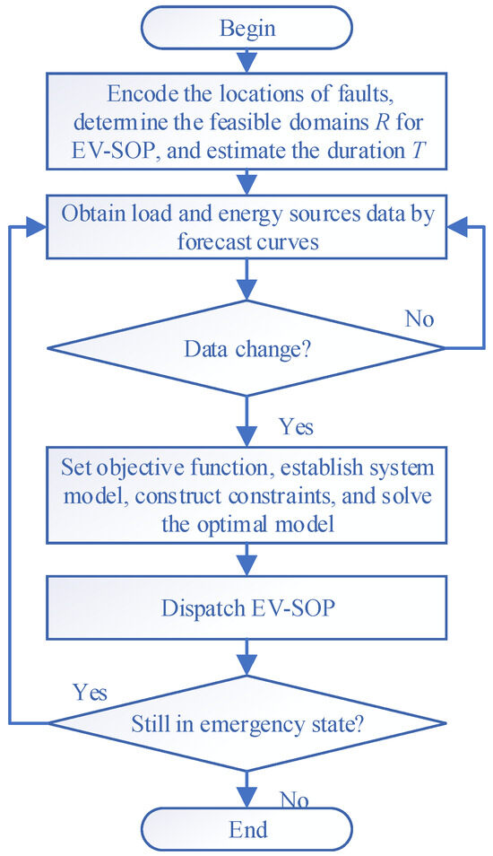 The emergency management strategy proposed here is structured around three core components: information collection, dispatch decision making, and optimization modeling. The primary process flow is detailed in Figure 3. Initially, real-time monitoring based on, e.g., a distribution network disaster warning and perception system (a widely used approach) is employed to determine the status of the distribution network. The locations of faults are encoded, and the feasible domains for dispatching emergency vehicles are subsequently determined. Simultaneously, by integrating fault experience with historical data, the duration (T) of line faults is estimated based on the extent and scale of the disaster. For example, if it takes 3–4 h to repair the line, then T could be taken as 3 or 4. Power prediction data are then obtained by using forecast curves for distributed energy sources and load profiles. Next, an assessment is performed to determine whether the emergency vehicle needs to be re-dispatched, ensuring that the connection location of the EV-SOP remains the optimal solution for various combinations of distributed energy outputs and load levels. Finally, a mathematical model of the system is established, with the objective of minimizing economic losses. Operational constraints for both the EV-SOP and the distribution network are set. The GUROBI solver is then utilized to determine the optimal control commands and power transmission instructions for the EV-SOP.