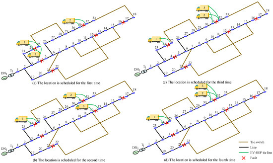 Figure 6a–d and Figure A1a–d illustrate the dispatch of EV-SOPs and traditional EVs over a four-hour emergency period. The diagrams show that during all periods of fault occurrence, all tie switches remain closed to maintain the power supply to the loads. Further observation of the emergency vehicle dispatch scenarios reveals that due to the power transmission capabilities of the EV-SOP, it adapts well to changes in source and load, requiring fewer re-dispatches and incurring lower dispatch costs.