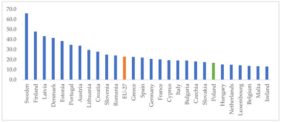 The share of renewable energy in gross final energy consumption has reached high values mainly in Sweden, Finland, Latvia, and Denmark (Figure 1). The share in most countries of Central and Western Europe is in the range of 20–30%, while the average for the European Union is 23%. Poland has the seventh lowest share of renewable energy in gross final energy consumption, at 16.9%. Differences between countries are primarily the result of different approaches to renewable energy (which may be reflected in the energy policy of a given country, access to natural resources, or investments in renewable energy technologies).