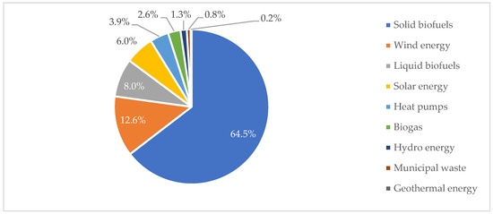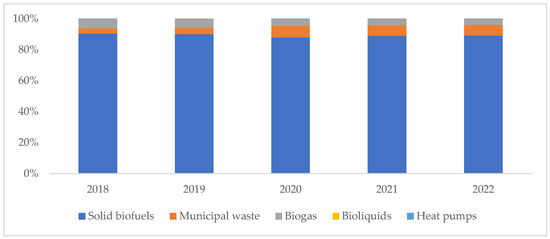 The share of renewable energy carriers in heat production in 2018–2022 (%). Source: author’s research based on [60].