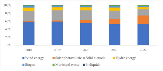 In 2018–2022, wind energy dominated the renewable energy mix in electricity production. However, its share decreased slightly despite the increase in electricity production from this carrier (Figure 3). The most dynamic growth was observed in photovoltaics (its share increased from 1% to 22% in the period under review). Energy from photovoltaic cells increased over 27.6-fold in the period under review, while wind energy increased only 1.5-fold. The relative stability of the share of hydropower and biogas in electricity production was also observed.