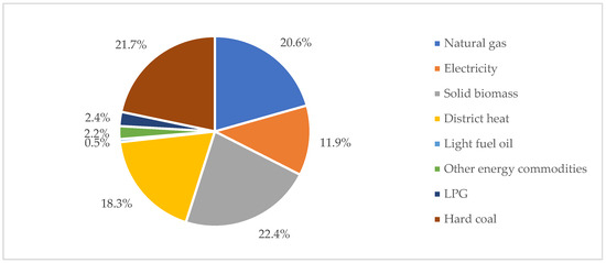 The leading energy carriers in Polish households in 2021 were solid biomass, hard coal, and natural gas (Figure 6). This situation differs significantly from that in the European Union, where the leading energy carriers were natural gas (33.5%), electricity (24.6%), and solid biomass (17.3%). Since the average electricity production from emission-free sources in 2021 accounted for about 14% of the total electricity production [62], it can be stated that the use of RES in households in Poland accounted for about 24%. The differences between Poland and the European Union have mainly been due to the availability of energy resources (hard coal, brown coal) or the country’s energy policy to date. Nevertheless, these differences highlight Poland’s challenges in energy transformation and adaptation to EU standards in sustainable development and CO2 emission reduction.