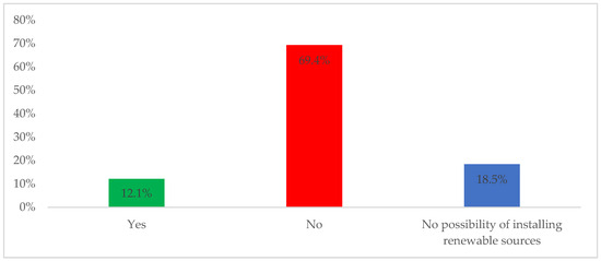 After indicating the space and water heating sources, the respondents were asked whether they had invested in renewable energy sources in their households in the last five years. Investments in renewable energy sources were made by 12.1% of households in the previous five years. Moreover, 18.5% stated that they could not install renewable energy sources because they did not own the flats or have the technical possibility of installing them (Figure 7).