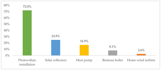 Respondents also indicated the source of their RES investment (Figure 8). The most significant number of investments were photovoltaic installations (72%), followed by solar collectors (25%), heat pumps (17%), biomass boilers (8%), and domestic wind farms (3%). The dominance of photovoltaics resulted primarily from significant government support (e.g., the “Mój prąd” program) but also from growing ecological awareness and the desire to become dependent on rising energy prices. The popularity of solar collectors was related to the fact that they are a very good complement to other heating systems used in households. The small interest in domestic wind farms resulted from legal and administrative restrictions and potential problems related to noise and esthetics of the immediate vicinity.