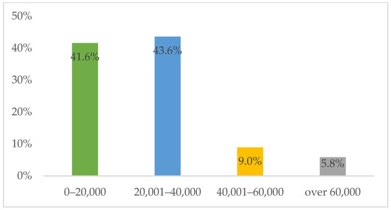Respondents indicated the total investment cost in renewable energy sources (Figure 9). The most significant number of investments (44%) fell from PLN 20,001 to PLN 40,000, followed by 42% of investments up to PLN 20,000. In addition, 9% of investments fell from PLN 40,001 to PLN 60,000, and 6% exceeded PLN 60,000. The dominance of investments up to PLN 40,000 reflects the popularity of photovoltaic installations, which often fall within this price range. In addition, it indicates the financial availability of renewable energy sources for the average household. A small share of more expensive investments may concern more advanced or complex systems (e.g., combining photovoltaics with a heat pump), but indicates that a minor part of society decides on more expensive but potentially more effective solutions. It is also possible that some investment costs are underestimated due to the failure to consider additional expenses (e.g., costs of modernizing the electrical installation).
