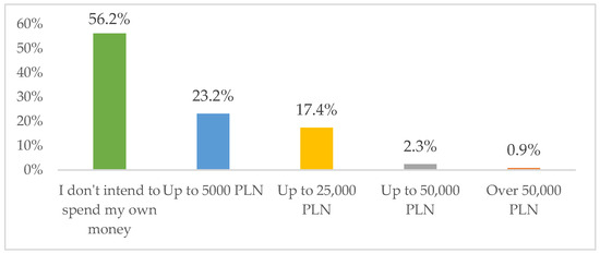 The increase in society’s ecological awareness is associated with increased knowledge of renewable energy sources, the possibilities of obtaining them, and ways to reduce their consumption. The higher the level of ecological awareness, the more knowledge people have in this area, and the more willingly they use unconventional energy sources. Additionally, it should be pointed out that the motivating factor in the context of reducing energy consumption or using renewable energy sources is financial considerations; hence, the respondents were asked how much they were willing to spend on renewable energy sources (Figure 12). More than half of the respondents, as many as 56%, did not intend to pay their funds; 23% declared that they could spend up to PLN 5000; and 17% were willing to spend up to PLN 25,000. Only 2% indicated an amount of up to PLN 50,000. Only 1% of the surveyed households were willing to spend on an investment exceeding PLN 50,000. The high percentage of reluctant investors was related to many households’ financial constraints and the belief that the state should finance the energy transformation. The dominance of smaller investments (up to PLN 5000) resulted from the desire to take the “first step” towards renewable energy, which is most often associated with smaller installations or individual devices. A small percentage of more significant investments was related to the limited group of wealthier households interested in comprehensive renewable energy solutions.