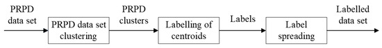 Figure 1 illustrates the PRPD label propagation strategy that we propose. It comprises three steps: (a) PRPD data set clustering; (b) labeling of cluster centroids; and (c) label spreading. In the first step, PRPD diagrams of the data set are grouped into clusters by using the k-means++ algorithm [16]. This procedure aims to provide an initial and rough classification of PRPDs according to the type of PD. Next, instead of labeling every PRPD of the data set as is usually done, only cluster centroids are manually inspected, which reduces the time required for this task. The amount of reduction depends on the number of clusters found at this stage. Then, in the last step, the labels attributed to each cluster centroid propagate to the other PRPD members of the respective cluster. The effectiveness of the whole procedure mostly depends on the quality of the first step; therefore, we dive deeper into our clustering strategy next.