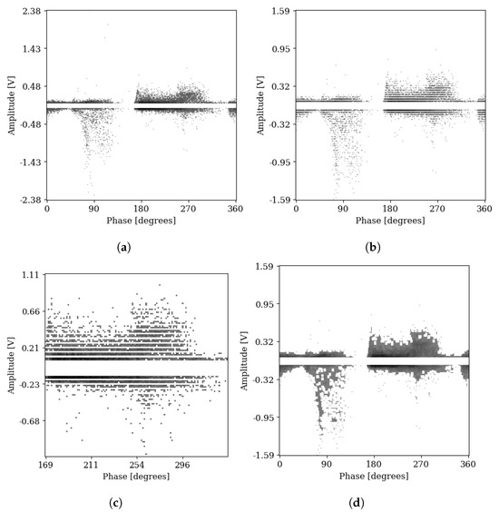 As the setup of data acquisition equipment must be tuned to maximize signal quality, the amplitude range of PRPDs can be different, even when such PRPDs are obtained from the same machine. Such a difference can potentially lead to misclassification issues in the clustering phase. For this reason, we introduce a scaling procedure to put all PRPDs under analysis in the same amplitude range. If the original amplitude range (Figure 2a) is higher than the range after scaling, the resulting PRPD will exhibit a pattern of horizontal empty lines (Figure 2b,c) that might also disturb the clustering phase. Thus, to mitigate such a pattern, we use a grey-scale closing operator with a 3 × 3-structuring element. The operation of grey-scale closing, which consists of grey-scale dilation followed by grey-scale erosion, is intended to reduce the amplitude of local minima, thereby filling the gaps created by the amplitude scaling procedure [17]. An example of the output of the closing operation applied to a scaled PRPD is shown in Figure 2d.