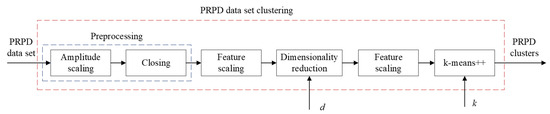 In our clustering strategy, two optional feature scaling blocks are located before dimensionality reduction and before clustering. Figure 3 depicts the complete processing chain for PRPD data set clustering, which includes the procedures of preprocessing, feature scaling, dimensionality reduction, and clustering.