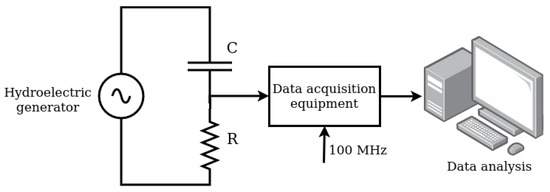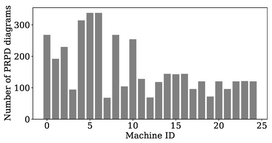 Our data set—provided by an electric utility company that operates in Brazil—is composed of 4079 PRPD examples obtained from online measurements in hydroelectric generators (Francis turbine-type, various manufacturers, and power ratings of 350 and 390 MVA) over a period from 2017 to 2021. Capacitive couplers are installed near the stator windings of the monitored machines, using a setup similar to Figure 4. The measurement system, named Instrumentation for Monitoring and Analysis of Partial Discharges (IMA-DP) [23], samples data at the frequency of 100 MHZ and employs a proprietary filter bank to identify partial discharge peaks and their corresponding phases relative to the sinusoidal wave (60 Hz).
