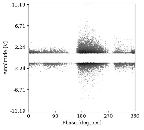 For the purpose of counting partial discharges, the acquisition software partitions the phase × amplitude plane into a matrix of cells. Figure 5 shows an example of a PRPD pattern from the data set.
