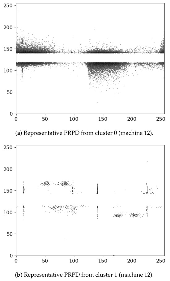 Representative PRPDs from clusters 0 (a) and 1 (b) obtained from the best configuration selected by the Silhouette score for the machine 12. Vertical and horizontal axes indicate the indices of a 256 × 256 PRPD matrix.