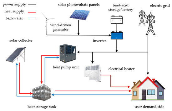 The area under study is rich in solar and wind energy. The energy supply form for the system is determined as follows: solar cells and wind turbines provide the primary electric power supply to the building, while heat pump units and solar collectors supply heat. However, due to the issues of abandoned light and wind, the effective utilization of renewable energy and the total amount of renewable energy may not fully meet the power load demands, necessitating the addition of auxiliary power supply and heating equipment. If necessary, power may also be drawn from the grid. Simultaneously, storage batteries and heat storage tanks serve as energy storage devices to ensure backup energy security for flexible load regulation in the system [38]. The system diagram is shown in Figure 1.