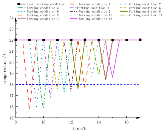 It can be seen from the above figure that the lowest indoor temperature occurs at 9:00 a.m. In Case 1, the indoor temperature is 15.7 °C, and for half of the time during the start–stop control period, the room temperature is below the set minimum temperature of 18 °C, in which case it is necessary to increase the indoor set temperature for the start–stop control to satisfy the human body’s thermal comfort needs; this is also the case for Case 2, Case 3, and Case 4. The vast majority of the time does not meet the human body’s adaptive indoor temperature, so the heat pump starts up half an hour later. Similarly, in Case 2, Case 3 and Case 4, which are similar to Case 1, the majority of the time does not meet the indoor temperature for the human body, so it is not reasonable to start and stop control of the system in the period of 8:30–10:00; the indoor temperatures from Case 5 to Case 9 are similar, with only a small period below the set minimum temperature, and it is possible to increase the initial indoor set temperature or shorten the equipment shutdown time to raise the minimum indoor temperature; the overall temperature ranges of Case 10 and Case 11 are similar, with only a small time below the set minimum temperature. The overall temperature range of working condition 11 is within the set temperature range, and the minimum value of the temperature is 18.8 °C. Within 13:00–14:00, the outdoor temperature reaches the maximum value of the day, and the indoor heat dissipation rate is minimal, where appropriately lowering the indoor initial set temperature or prolonging the equipment shutdown time will not affect the indoor personnel’s thermal comfort, and there is still great potential for regulation of the heat load. Finally, the minimum temperatures of conditions 12 and 13 have recovered, and the loads have the same potential for regulation.