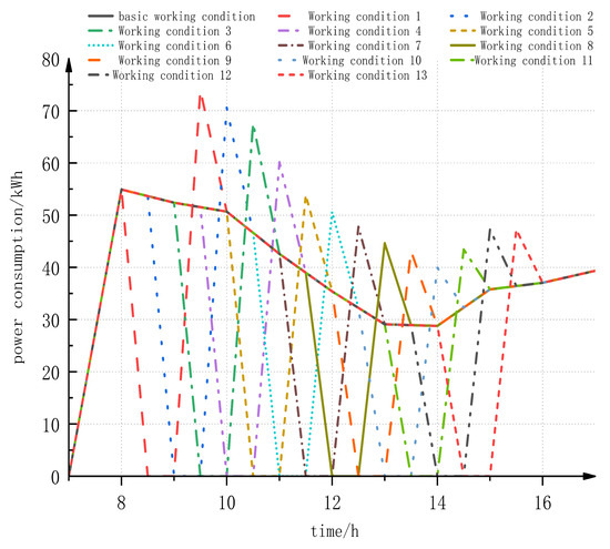 From the figure, it can be seen that at 13:30, the power consumption values of condition 7, condition 11, condition 15, and condition 19 are 29.1 kWh, 30.7 kWh, 32.4 kWh, and 34.1 kWh, respectively, and after the equipment stops working, the power consumption of each condition becomes 0 kWh from 13:30 to 14:30.