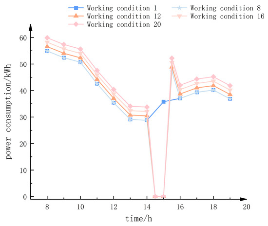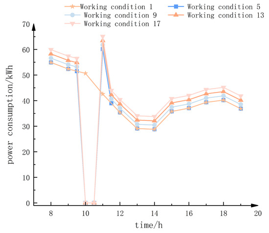 As can be seen from the figure, at 10:00, the power consumption of condition 5, condition 9, condition 13, and condition 17 is 51.5 kWh, 53.1 kWh, 54.8 kWh, and 56.5 kWh, respectively. After the equipment stops working, the power consumption of each condition becomes 0 kWh from 10:00 to 11:00.