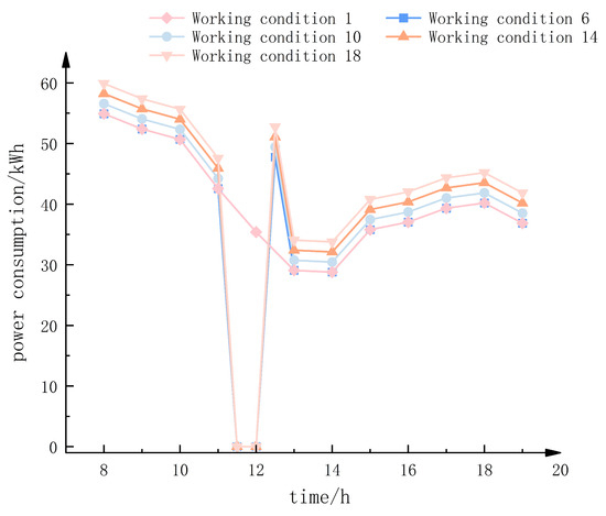From the figure, it can be seen that at 11:30 a.m., the power consumption of condition 6, condition 10, condition 14, and condition 18 is 42.6 kWh, 44.2 kWh, 45.9 kWh, and 47.6 kWh, respectively, and the power consumption of each condition from 11:30 a.m. to 12:30 a.m. after the equipment stops working becomes 0 kWh.