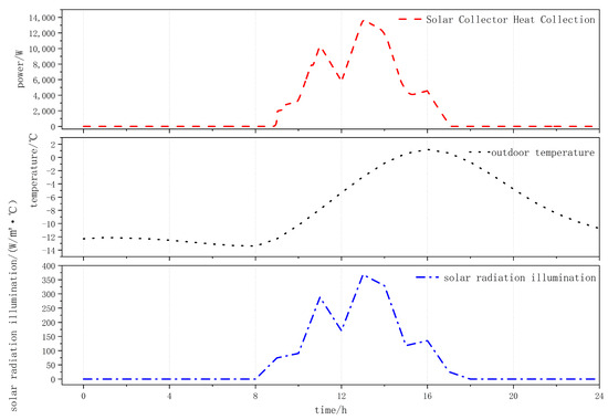 This figure presents the curve of solar thermal collector performance alongside outdoor temperature and solar irradiance, as shown in Figure 9.