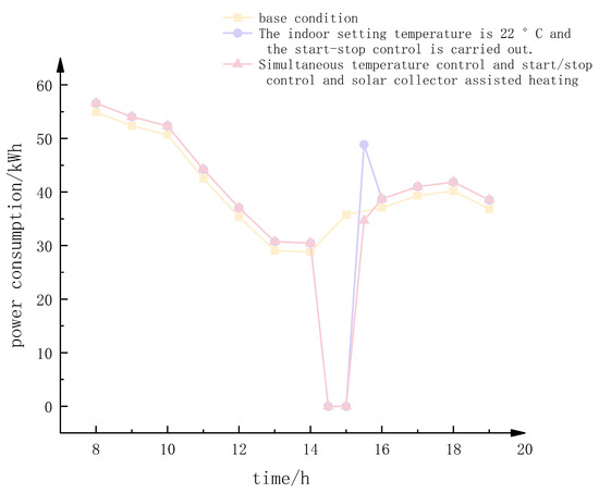 As illustrated, the solar collector began collecting heat at 9:00 a.m., with the amount of heat collected increasing with rising outdoor temperature and solar irradiance, peaking at 14 kWh by 1:00 p.m. The collector ceased to collect heat after three hours. The solar collector, in conjunction with a thermal storage tank, collects heat during the day and releases it between 14:30 and 15:30 p.m. to assist in preheating the heat pump unit, thereby reducing the electrical load of the heat pump unit. The power usage of solar collectors for auxiliary heating is depicted in Figure 10.