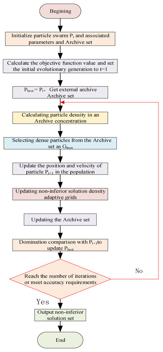 With appropriate parameter settings and algorithm design, MOPSO can effectively find the optimal set of solutions satisfying multiple objectives in a multi-objective optimization problem. The algorithm has been widely used in various fields, such as engineering optimization, machine learning, data mining, etc. The flowchart is shown in Figure 11 below: