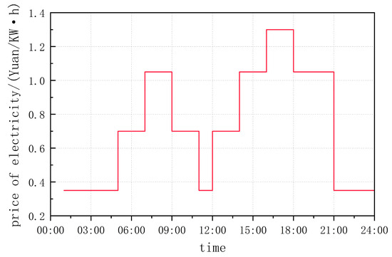 After conducting an investigation, the converted unit costs of solar photovoltaic (PV) cells, wind turbines, lead–acid batteries, and heat pump units are presented in Table 7. Additionally, the time-of-day tariffs in Shenyang are illustrated in Figure 14.