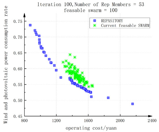 Utilizing the established multi-objective particle swarm optimization algorithm, the processed daily electric load of public buildings in cold regions and the optimized power usage of heat pump units were inputted into the multi-objective particle swarm optimization model on MATLAB, enabling the optimal scheduling of power equipment operation after setting the initial parameters. In this study, the population size for the multi-objective particle swarm optimization algorithm was set to 100, with a maximum of 100 iterations. The optimization results were obtained after 100 iterations, as shown in Figure 15 below.