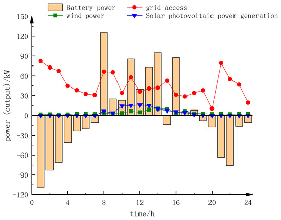 From the figure, it is evident that during the actual scheduling process, some wind and solar power generation may still occur; however, the overall consumption rates for wind and solar power exceed 75%. The most unfavorable point for wind power generation consumption occurred at 4:00 p.m., while the least favorable point for solar PV power generation consumption occurred at 9:00 a.m. The combination of battery storage and grid power usage for system load scheduling is depicted in Figure 17.