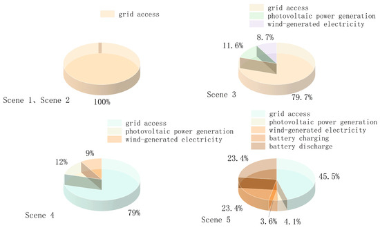 From the figure above, it is evident that in Scenarios 1 and 2, renewable energy is not utilized and there is sole dependence on grid electricity. However, the carbon emissions in Scenario 2 are 96.6% compared to those in Scenario 1. Scenarios 3 and 4 exhibit similar energy profiles; however, due to the optimization of flexible thermal load operation, the total load decreases, resulting in a corresponding reduction in grid electricity consumption. Meanwhile, the amounts of wind and solar power generated remain unchanged, leading to increased percentages. In Scenario 5, which considers both flexible thermal load operation and flexible electric load scheduling optimization, the proportion of grid power withdrawal is 45.5%, while wind power and PV power generation account for 3.7% and 4.1% of grid power withdrawal, respectively. The use of batteries does not affect electric load amounts and is subject to constraints, with charging using either grid power or excess wind and solar power ensuring that discharged and charged quantities remain equal, resulting in a proportion of 23.4%.