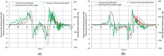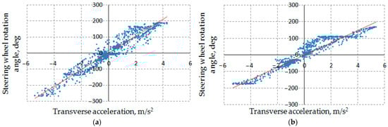 Table 6. Based on the analysis, it should be noted that a decrease in the speed of the car caused a clear increase in the increment of the steering angle relative to the normalized acceleration, while there was no clear change in the increment of the torque on the steering wheel. Steering effort is considered favorable if it is in the range of 1050–26,250 Nm° [