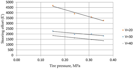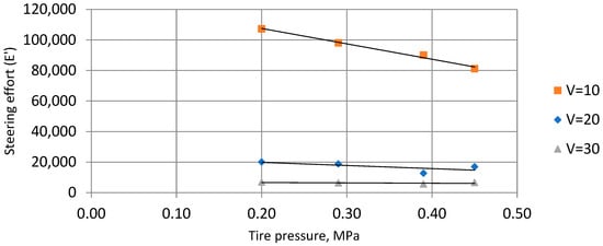32]. The higher the effort, the more energy is consumed by the power steering system. For the case under review, the steering effort values determined for a car traveling at 20 and 30 km/h fell within this range. Reducing the speed of the car to 10 km/h resulted in a significant increase in the value of the steering effort index. The values of the steering effort index for this speed exceeded the values of the range considered favorable several times and, depending on the tire pressure, amounted to 107,322.5 Nm°, 98,127.67 Nm°, 90,026.52 Nm°, and 81,188.84 Nm° (