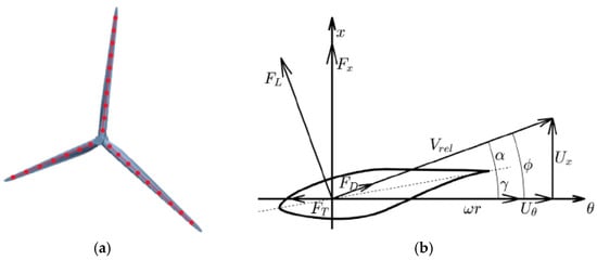 where ρ is the density of air, c is the chord length of the blade section, and sum is the unit vector of the direction of rise and resistance. The axial force, Fx, and the tangential force, FT, can be further transformed from the lift force and drag force.