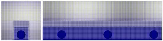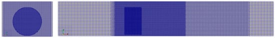 Based on the above research, in the current paper, the extended k-ε turbulence model is realized by adding the ε source term, the minimum grid size of the actuator simulation is set to 0.01 m, the time step is set to 0.001 s, the flow velocity is 10 m/s, and three-level mesh encryption is used, which results in the maximum CFL number of about 1, and the stability of the computation is higher in all cases. The grid encryption schematic shown in Figure 3.