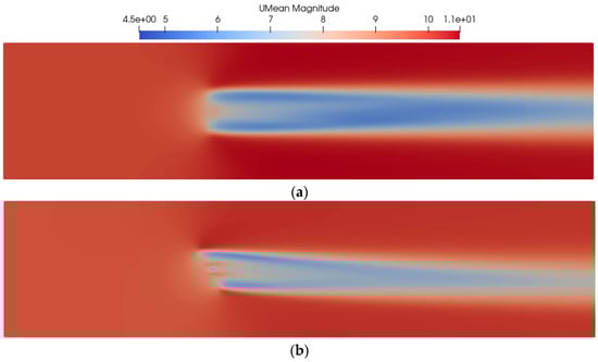Velocity contours of the ALM simulation with a turbulence intensity of 10%. (a) Horizontal velocity profile without yaw and (b) horizontal velocity profile with yaw = 30°.