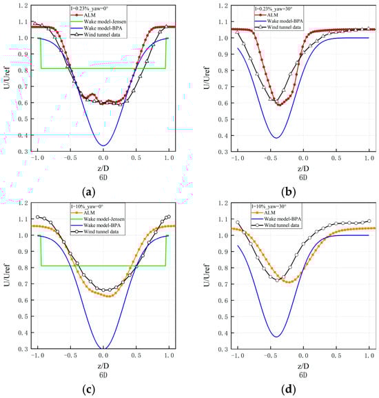 Comparison of wake velocity profiles at 6D downstream. (a) TI = 0.23%, non-yaw; (b) TI = 0.23%, yaw = 30°; (c) TI = 10%, non-yaw; (d) TI = 10%, yaw = 30°.