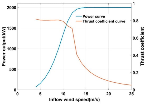 The Horns Rev wind farm is a large-scale offshore wind farm, which is often used for wake prediction studies around the world because of its long-term observation data. The wind farm consists of 80 Vestas-V80 2 MW wind turbines arranged in a regular array of 8 rows and 10 columns distanced by 7D. The Vestas-V80 2 MW wind turbine has a diameter of 80 m and a hub height of 70 m. The power curve and thrust coefficient curve of the wind turbine are shown in Figure 7.