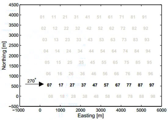 When the wind direction is westerly, that is, the incoming flow is 270°, the difference in the average power of rows 2~7 is negligible compared with that of rows 7 alone []. Therefore, as shown in Figure 8, the 10 wind turbines in the 7th row of the wind farm are used as the simulation objects to study wind farm wake regulation.