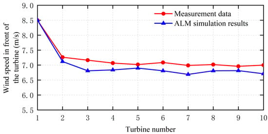 Figure 11 shows the comparison between the ALM simulation results and the measured wind speed data in front of each wind turbine in row 7 of the wind farm. It can be seen that the ALM simulation has satisfied agreement with the measurement data. The maximum relative error is about 4.4%, occurring at the third wind turbine. The relative error is defined by the absolute error normalized by the incoming wind speed, i.e., 8 m/s. It shows that the ALM can predict the recovery of wind speed in the wake of tandem wind turbines with high accuracy.